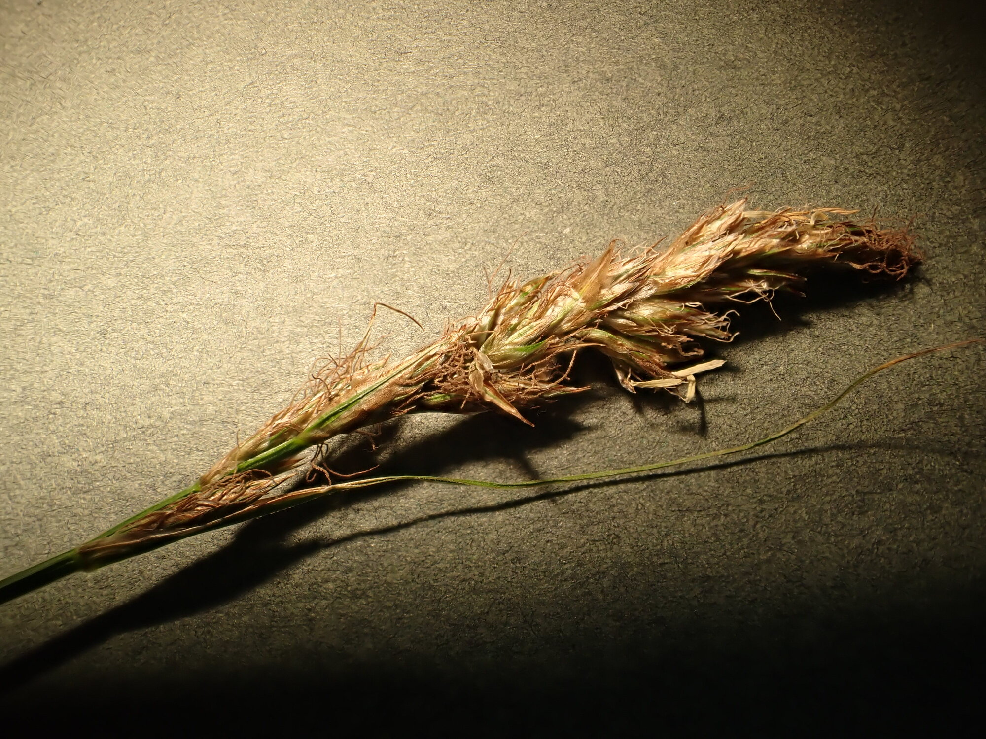 Oh pardon j’ai oublié de préciser: rhizomateux, tige trigone, scabre, 2 stigmates, fleurs mâles visibles sur les photos, épillets inf et sup femelles, épillets mâles au milieu de la panicule spiciforme…gaines vertes…