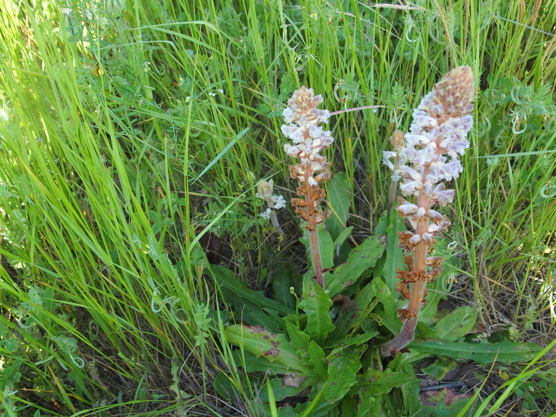 Une orobanche poussant sur un Picris, photographiée parce qu’elle atteint une taille supérieure à ses voisines qui surgissent dans un amalgame de plantes enchevêtrées. Ces dernières sont plus graciles mais la structure de leurs fleurs est proche.