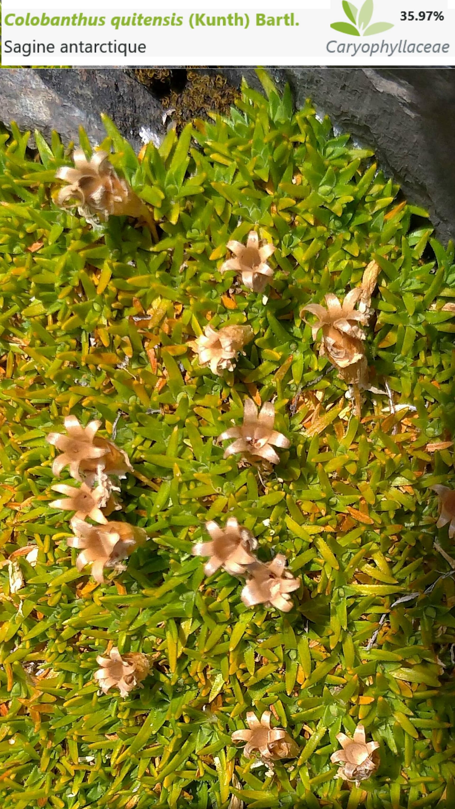 Cette plante, photographiée lors de la sortie de l’Estany de Lanos, est identifiée comme Colobanthus quitensis (Kunth) Bartl. (Sagine antarctique) Caryophyllaceae, par « Plantnet ».