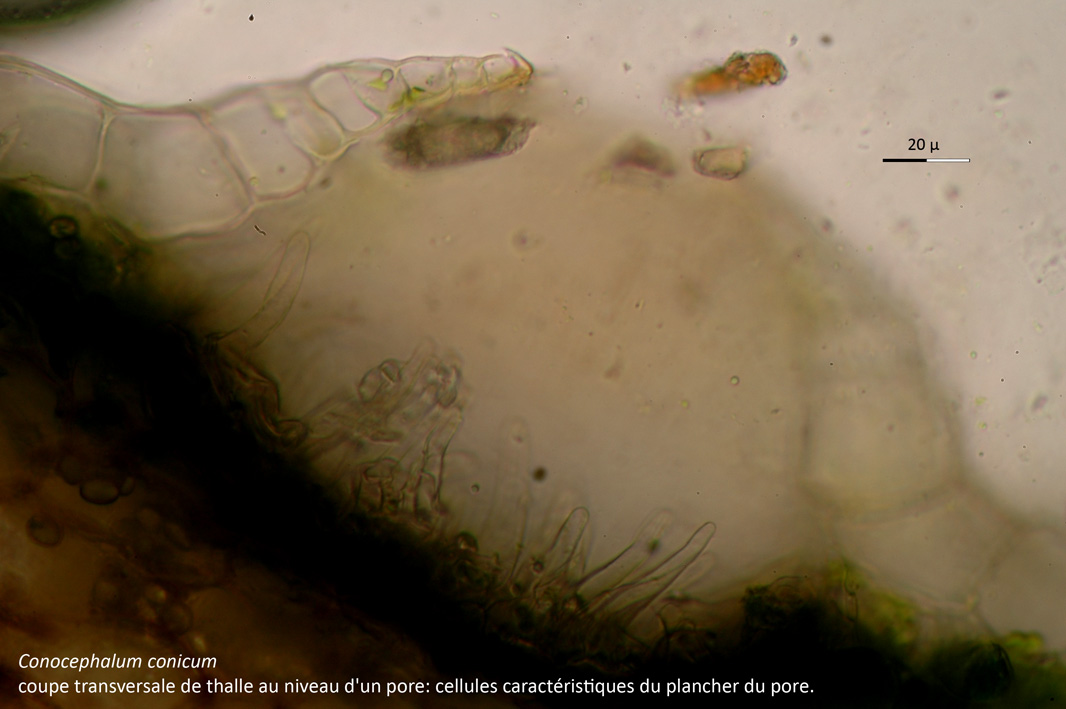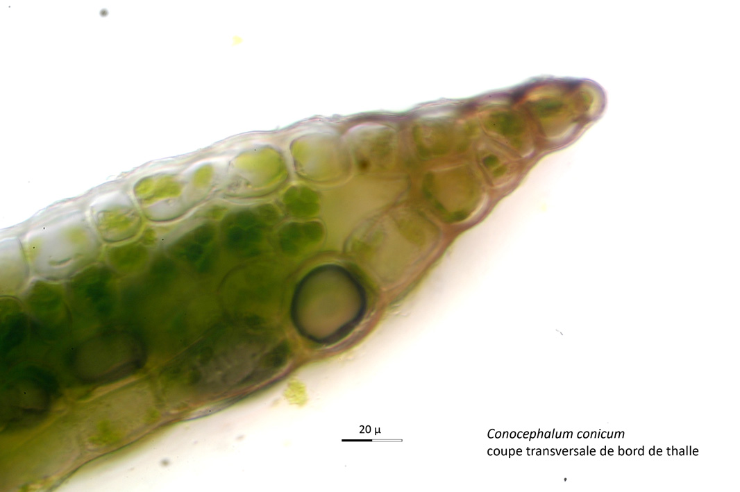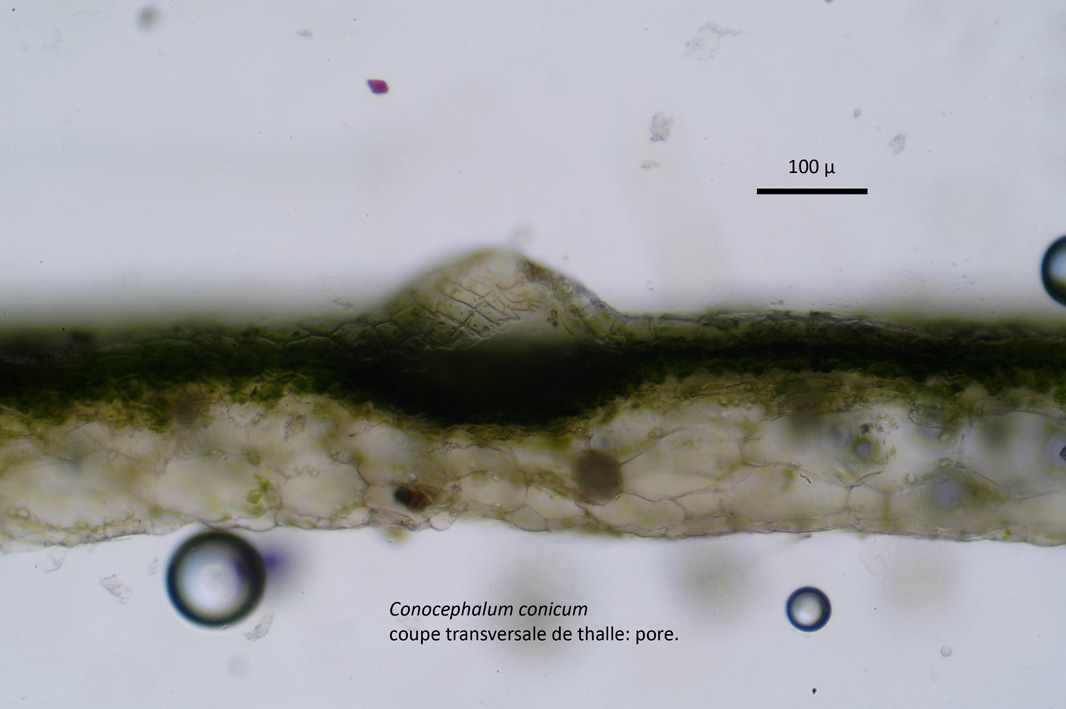 Voici quelques photos de l’hépatique à thalle que m’a confiée Philippe dimanche: Conocephalum conicum, ramassé à Céret (Baoussous). Le genre se reconnaît entre autres par la forme conique du réceptacle femelle, présent ici à l’état juvénile (le pied ne s’est pas encore allongé). L’espèce se distingue (difficilement) de l’autre espèce, Conocephalum salebrosum, par le nombre de cellules de la marge du thalle (voir la coupe) sur plus de 3 rangs, les pores très saillants, la forme des cellules du plancher des pores, non renflées à la base, etc …
