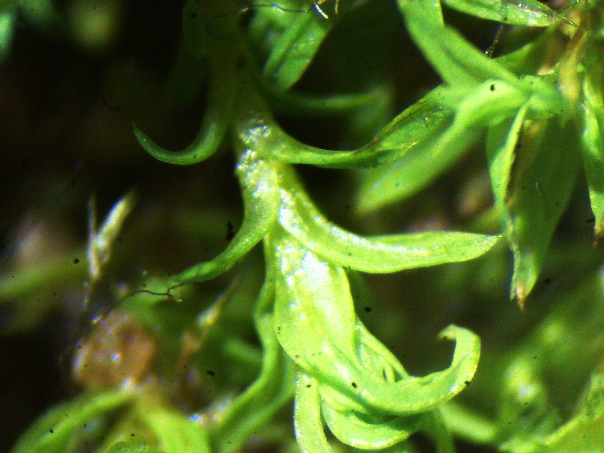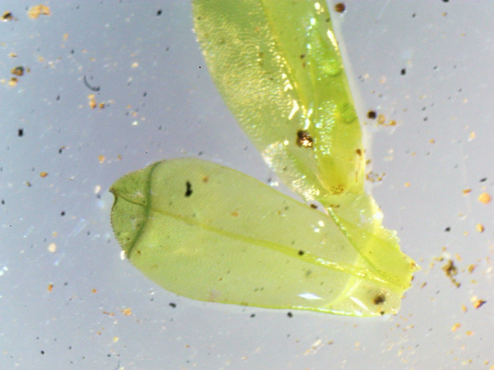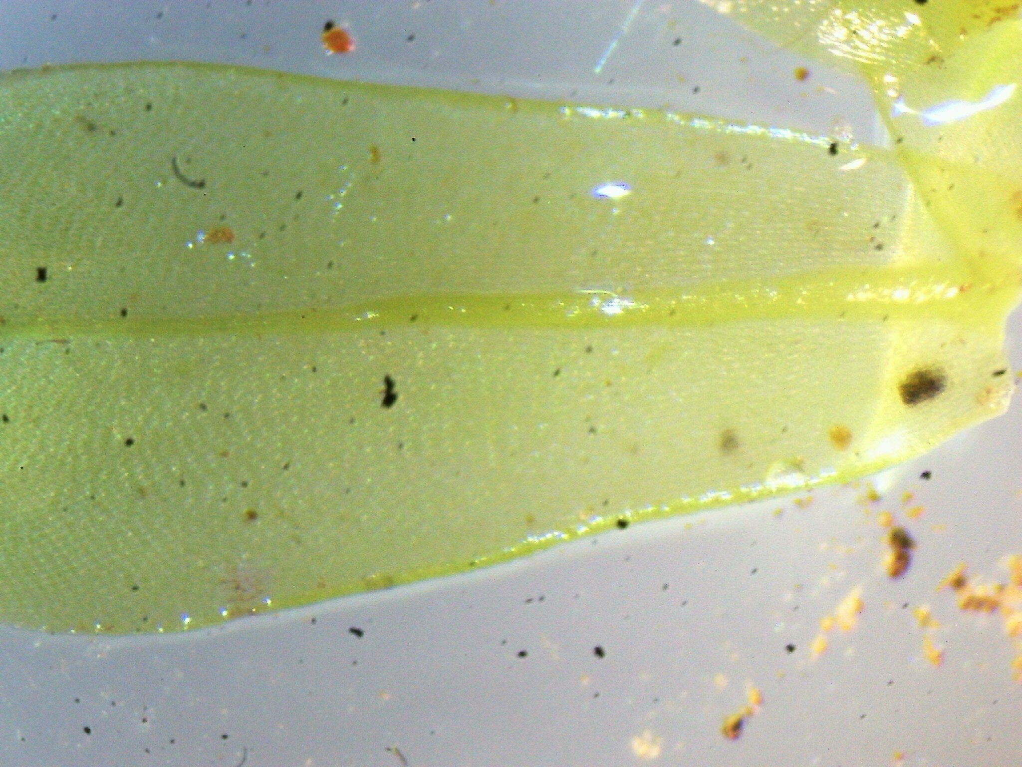 Mousse acrocarpe à feuilles à base translucide et nervure excurrente (dépasse en une petite pointe) / bordure récurvée presque jusqu’à la base / cellules papilleuses ? Famille des Potiacées / Base de la feuille hyaline (ressemble à Tortella sp.)