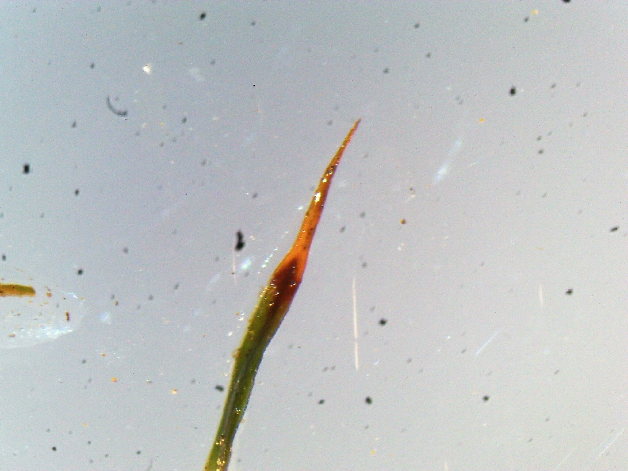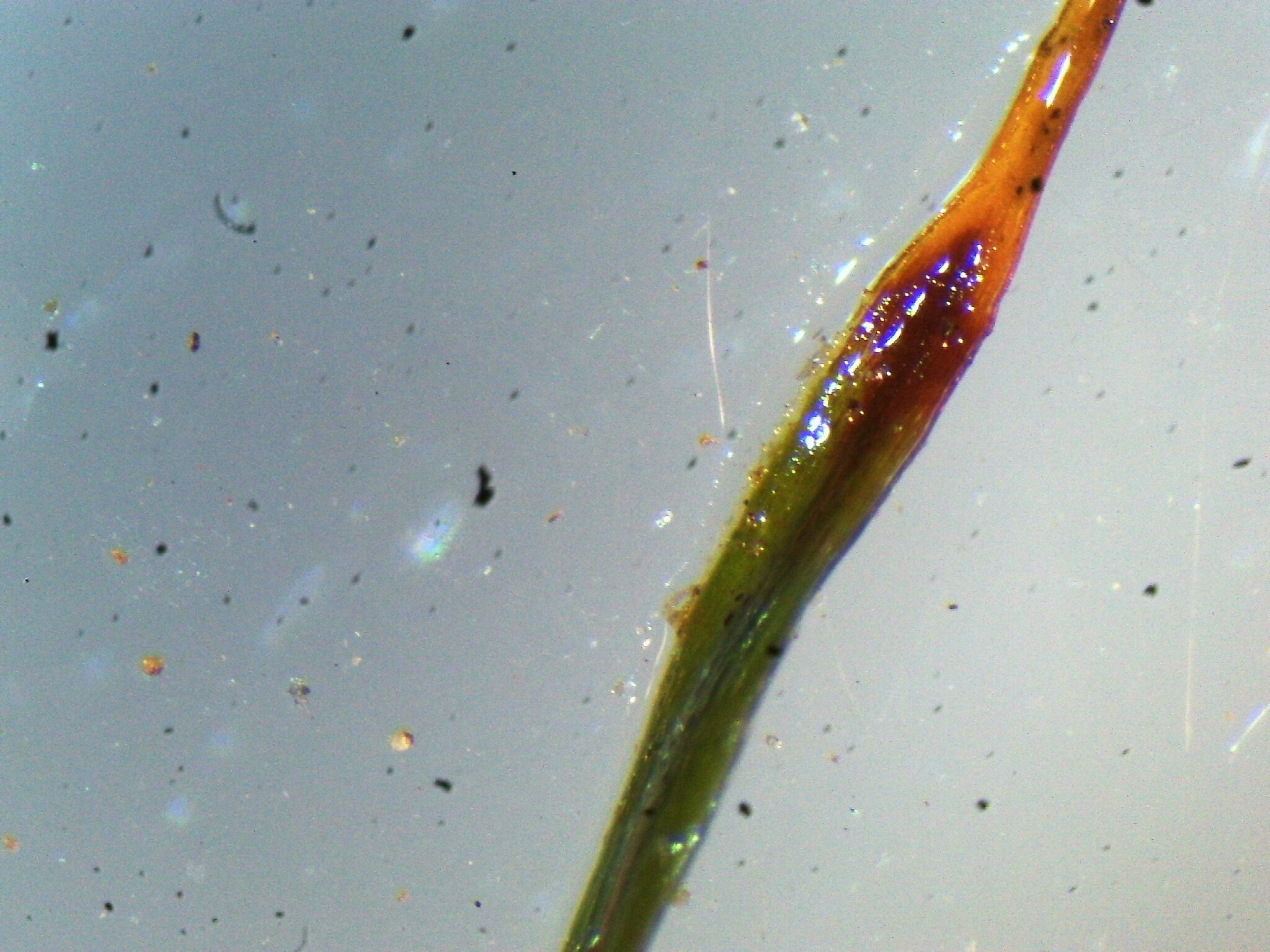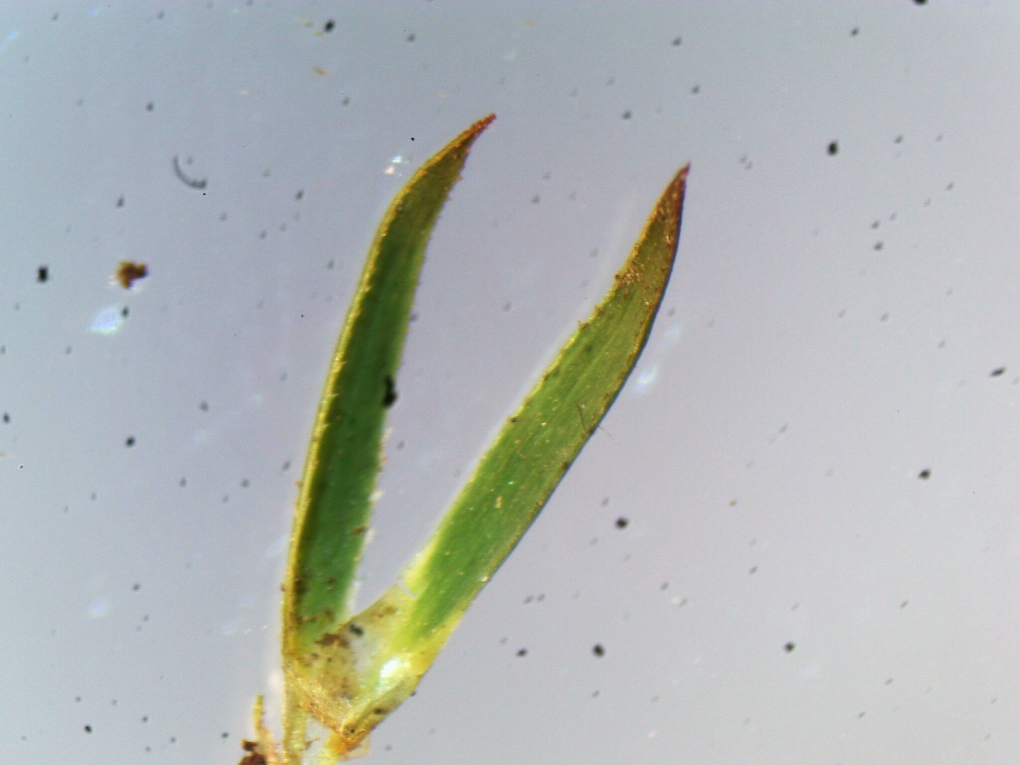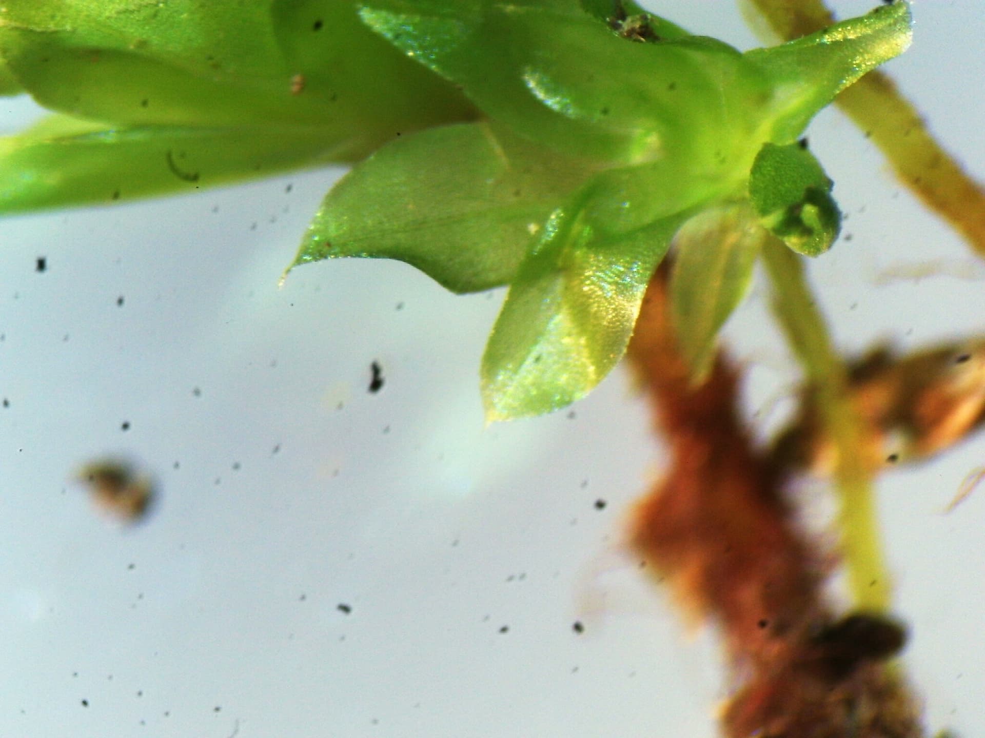 Mousse acrocarpe à feuilles à base translucide et nervure excurrente (dépasse en une petite pointe) / bordure récurvée presque jusqu’à la base / cellules papilleuses ? Famille des Potiacées / Base de la feuille hyaline (ressemble à Tortella sp.)