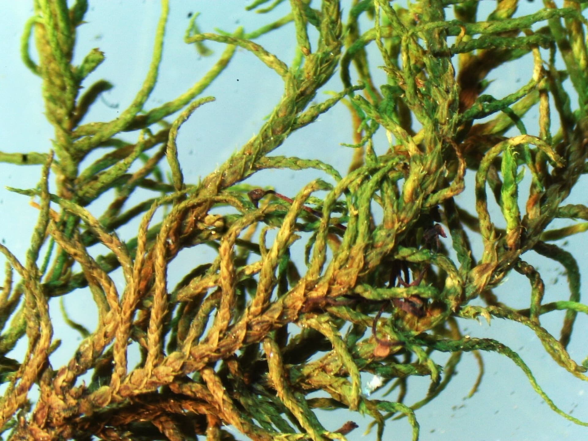Abietinella abietina (Thuidiacées) pleurocarpe / tige principale à feuilles largement triangulaires et rameaux à feuilles plus petites, ovales-lancéolées / paraphylles sur la tige entre les feuilles